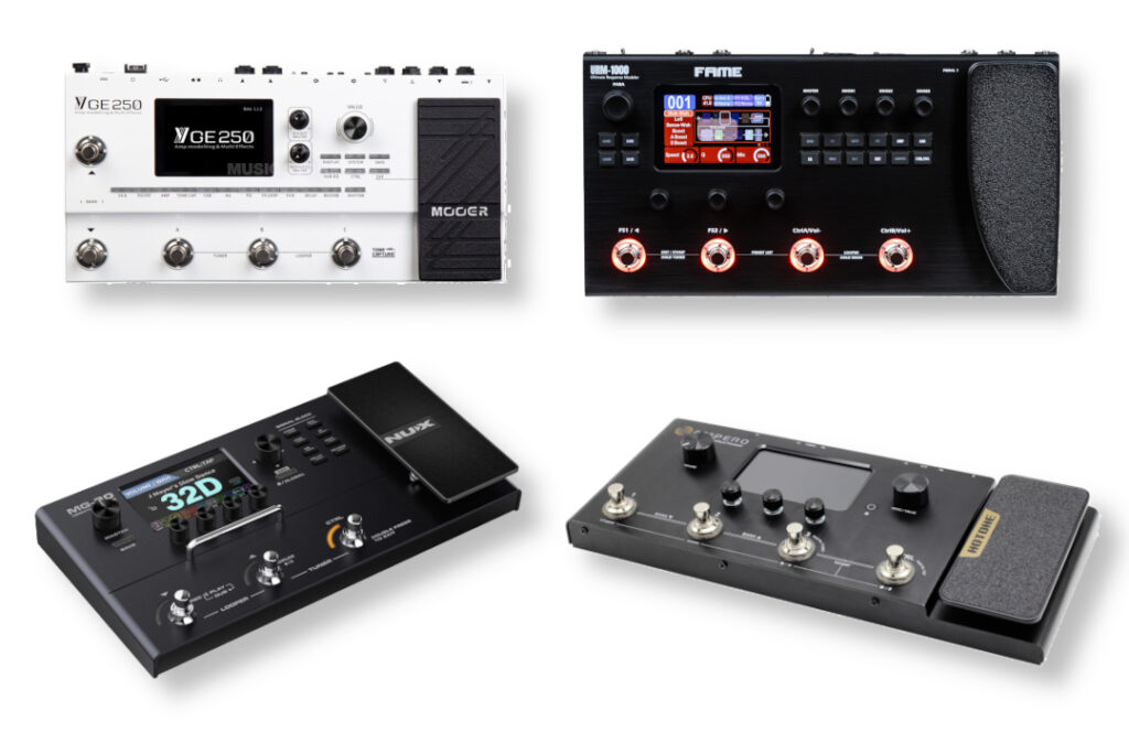 Nux MG-30, Mooer GE250, Hotone Ampero und FAME URM-1000.