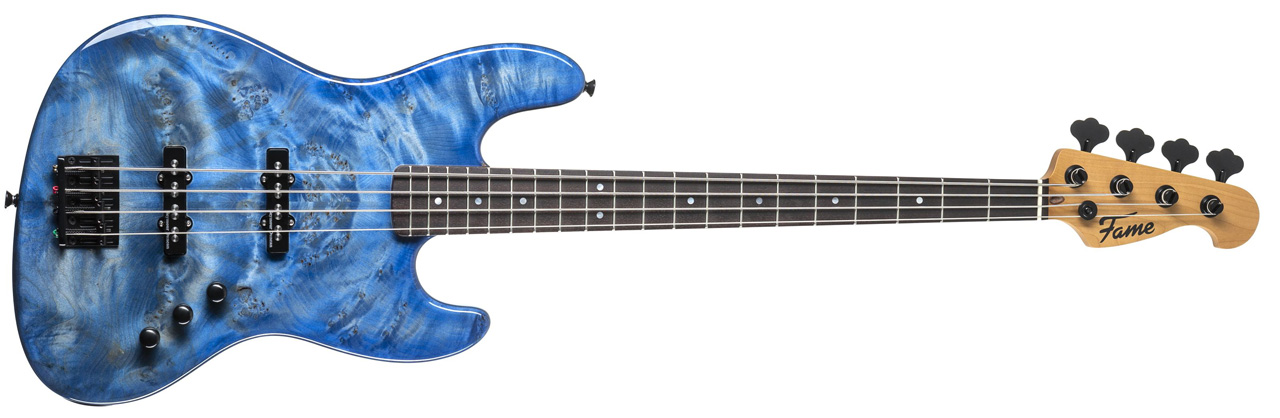 Die Korpusformen des Fame PB und JB folgen den allgemeinen Abmessungen ihrer Vorbilder. Was die Tonholzkombination anbelangt, weichen sie jedoch etwas vom klassischen Rezept ab. Beide Bassmodelle setzen nämlich auf massive Erle mit für die beiden Bass-Designs eher ungewöhnlichen Maserpappeldecken, wie sie bereits auf den Sondermodellen Fame Forum IV Anniversary zum 20. Jahrestag der europäischen Gitarrenschmiede zu sehen waren.