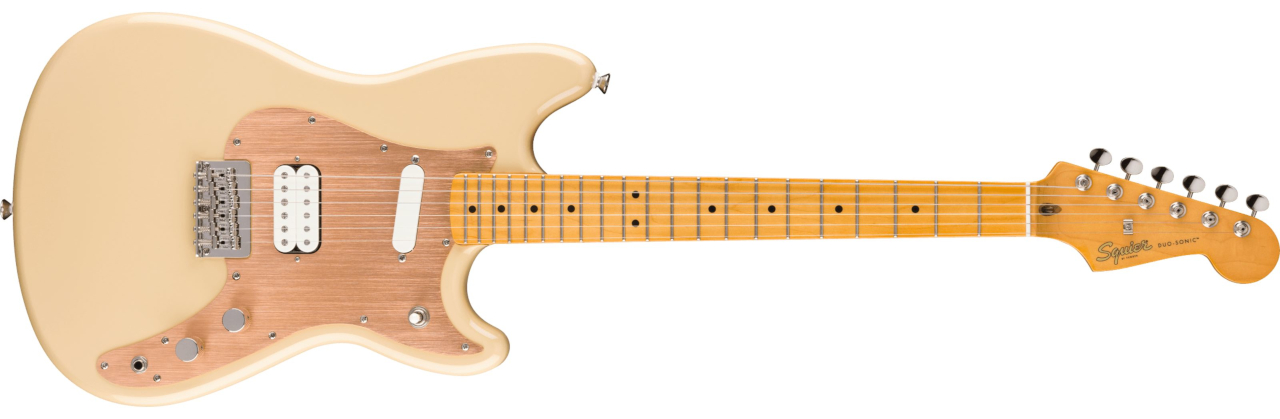 Obwohl die Offset-Gitarren traditionell eher den Nischenmarkt des Alternative/Indie Rock und Shoegaze bedienen, erfreuen sich die Klassiker Jazzmaster, Mustang & Co gerade in letzten Jahren stetig wachsender Beliebtheit. Ein oft übersehenes Modell ist hier allerdings die Fender Duo-Sonic, die gemeinsam mit der Musicmaster schon im Jahr 1955 als ‚Schüler-Modell‘ entworfen wurde. Die heutigen Ausführungen der Duo-Sonic sind eng mit der Mustang verwandt und bieten dasselbe Korpus-Design mit verkürzter 610-mm-Mensur für butterweiche Bendings und eine resonante und unkomplizierte Fixed Bridge. Die Duo-Sonic ist aktuell als Squier Classic Vibe Duo-Sonic in Lake Placid Blue und Desert Sand erhältlich und bildet mit ihrem HS-Tonabnehmer-Setup die perfekte Grundlage für kräftige Rock-Sounds mit ganz eigenem Charakter.