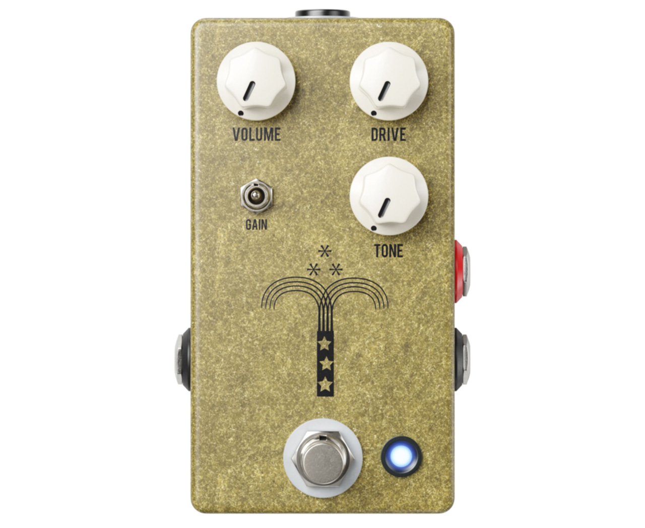 Inzwischen bei der Version V4 angekommen, bekommen wir das Morning Glory in einem mattgoldenen Gehäuse, welches klar macht, dass wir hier etwas Edles in der Hand halten. Auch die cremefarbenen Potiknöpfe sehen klassich chic aus und steuern wie gewohnt Volumen, Drive und Ton. Fußschalter und Miniswitch für die Gain-Stufe machen einen soliden, langlebigen Eindruck und die In- und Output-Buchsen sind seitlich angebracht. Über der Input Buchse finden wir einen TS-Anschluss für einen Fußschalter, mit welchem wir den Gain Boost per Fuß anstelle des Mini-Switches einschalten. Darüber hinaus ist auf derselben Seite der Kippschalter für den Hi-Cut. Dieser ist vorteilhafterweise im Gehäuse eingelassen, was ein versehentliches Verstellen unmöglich macht. Der 9V DC Anschluss ist auf der Oberseite, Batteriebetrieb ist nicht vorgesehen.
