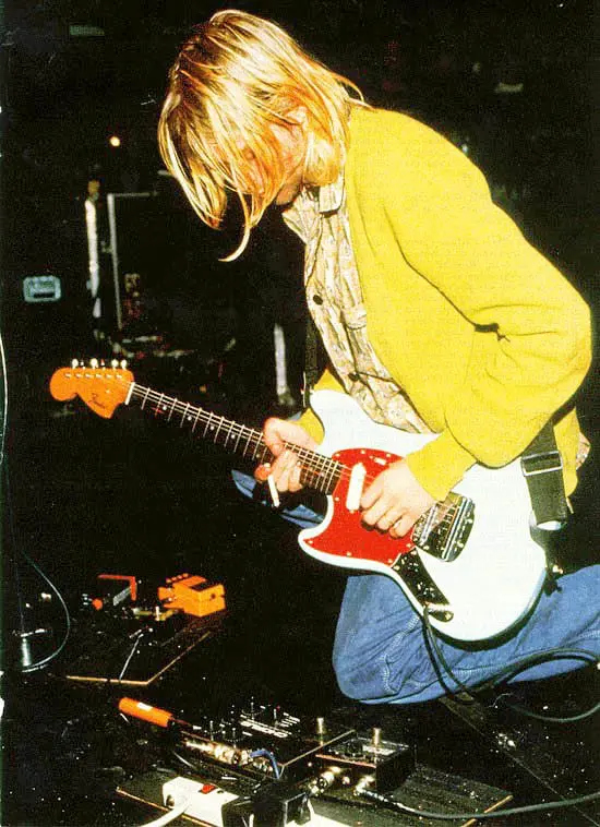 Typischerweise hatte er die Lautstärke voll aufgedreht, den Tone-Regler zwischen elf und ein Uhr positioniert und die Distortion meist bis zum Anschlag aufgedreht. Später wechselte er häufig zum Boss DS-2 Turbo Distortion, den er meist in Mode 1 verwendete, was klanglich quasi an den DS-1 herankommt. Während der In Utero-Phase kam zudem der Tech 21 SansAmp Classic zum Einsatz, vor allem dann, wenn Cobain eine etwas weniger harsche und eigenständigere Verzerrung bevorzugte.