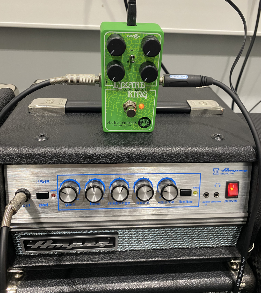 Besonders interessant zeigte sich der Lizard King im Zusammenspiel mit einem Ampeg Micro VR Topteil und einer 2×10”-Box (SVT-210AV). Bereits moderate Blend- und Octave-Einstellungen reichten aus, um einen massiven, dichten Ton zu erzeugen. Der mittige Charakter des kleinen Ampeg-Stacks harmoniert hervorragend mit der komprimierten Obertonstruktur des Pedals. Im Shadow-Modus bleibt die Bassgrundlage natürlich und tragfähig, während der Sun-Modus mit deutlichem Mid-Push für Solo- oder Lead-Momente sorgt.