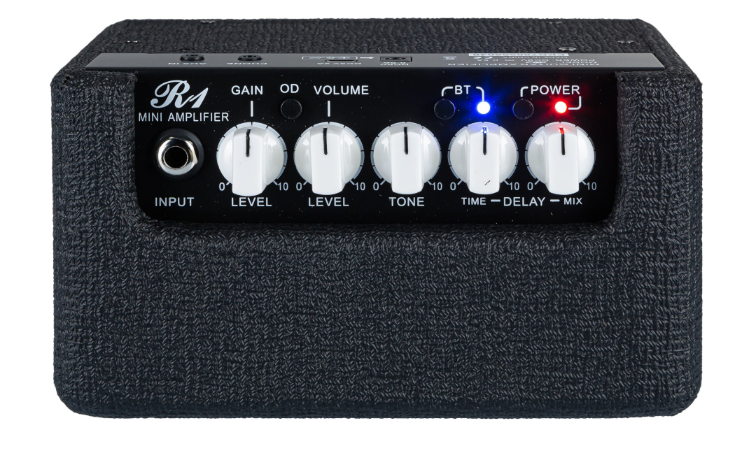 Fame R1 Mini Amplifier mit Regler Gain-Level, Volume-Level, Tone, Delay-Time und -Mix.