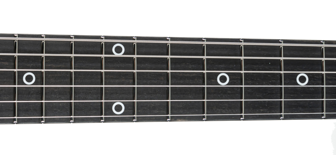 Das Ebenholzgriffbrett mit den White Atlante Rings als Inlays setzt einen stilvollen Kontrast zur dunklen Hardware und rundet das Gesamtbild harmonisch ab. Insgesamt vermittelt das Instrument einen hochwertigen, professionellen Eindruck, der sich klar von typischen Core-Serien abhebt.