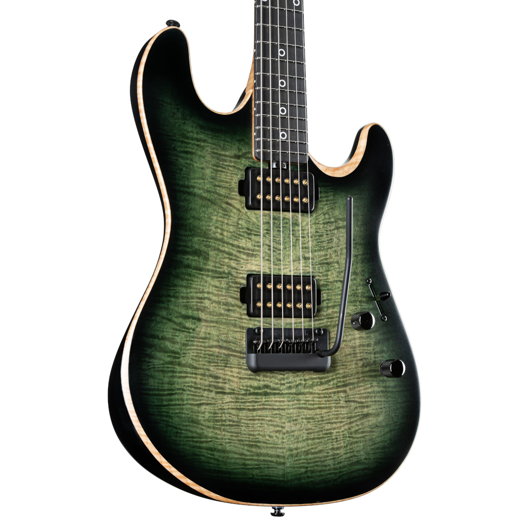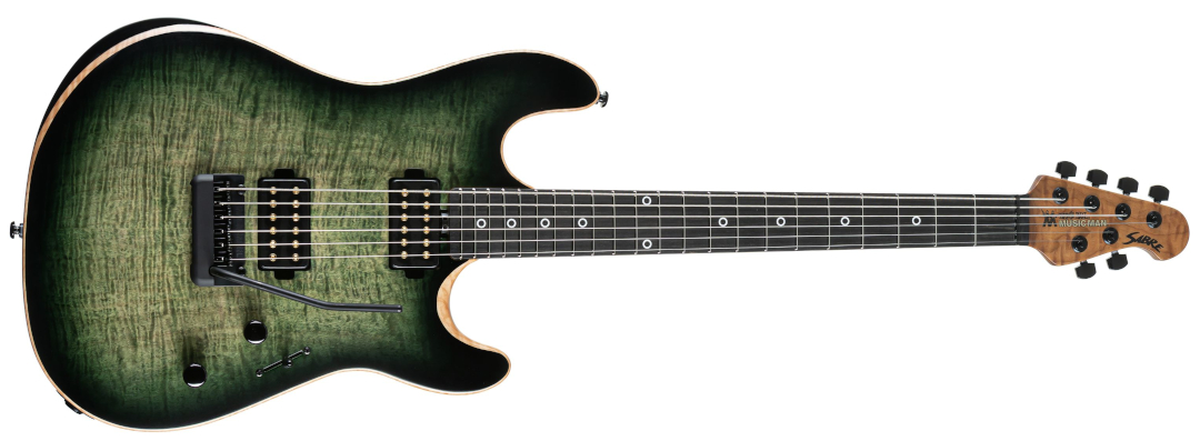 Als Basis dient die Music Man Sabre-Bauform, die hier um mehrere spezifische Anpassungen erweitert wurde. Der Korpus besteht aus Erle, kombiniert mit einer Riegelahorn-Decke, und ist mit einem hochwertigen Emerald Hill Burst Finish versehen. Die satinierte Oberfläche unterstreicht den modernen Charakter der Gitarre, ohne dabei zu steril zu wirken.